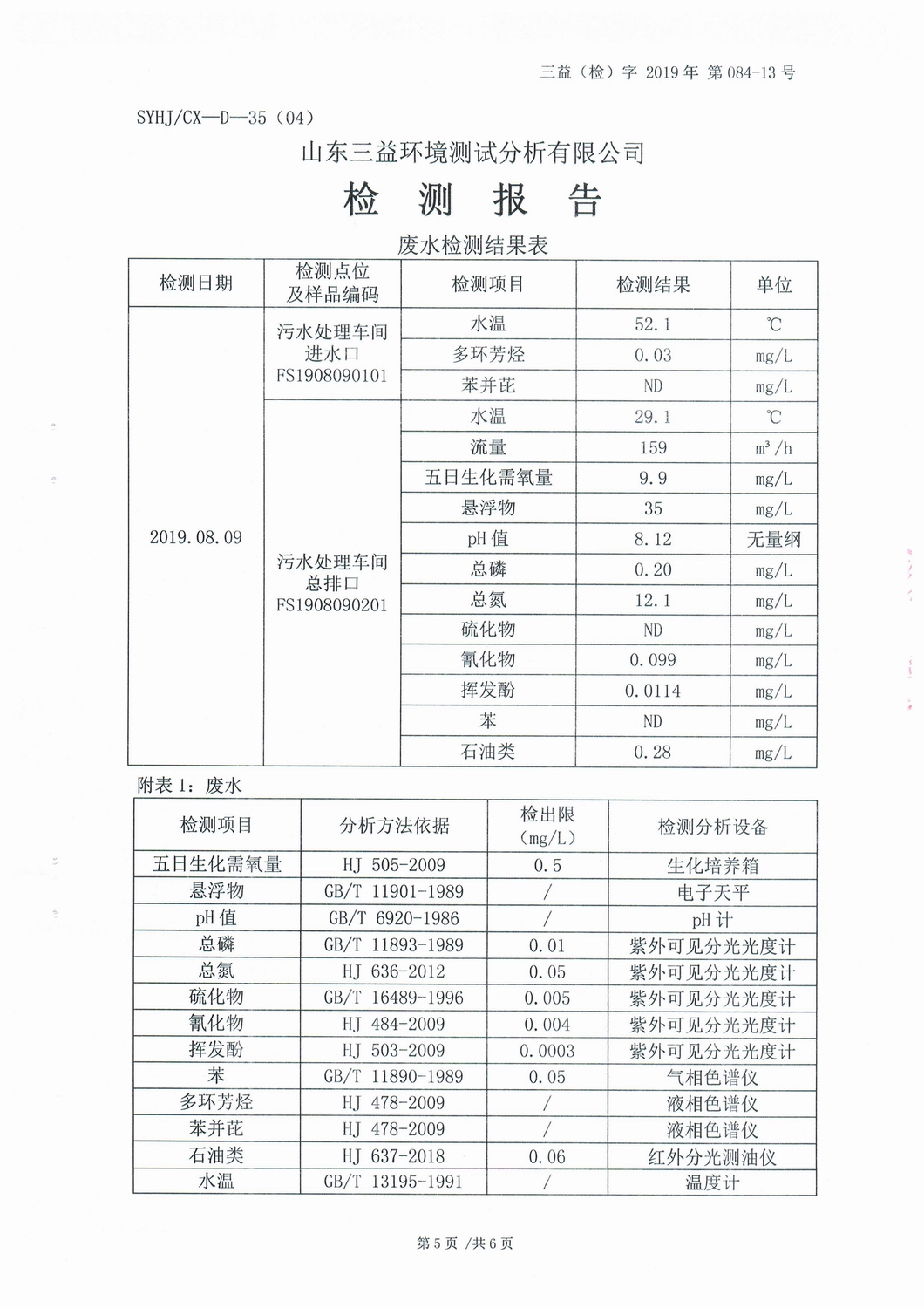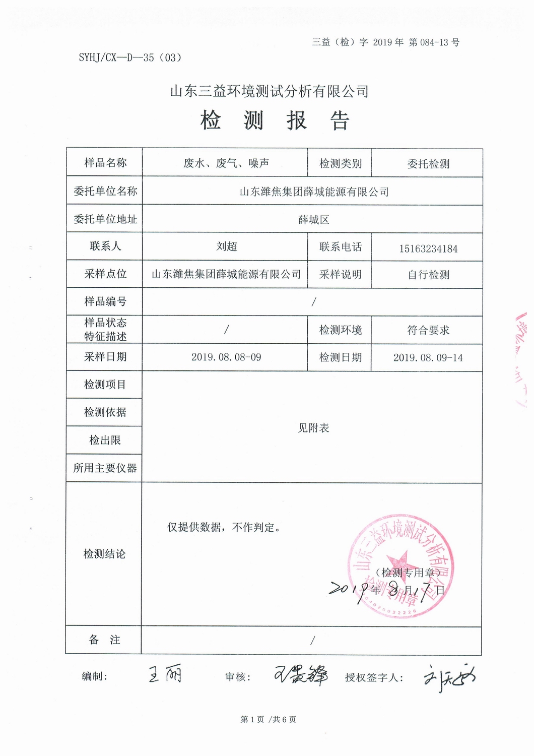 山東濰焦集團(tuán)薛城能源有限公司8月份檢測(cè)報(bào)告